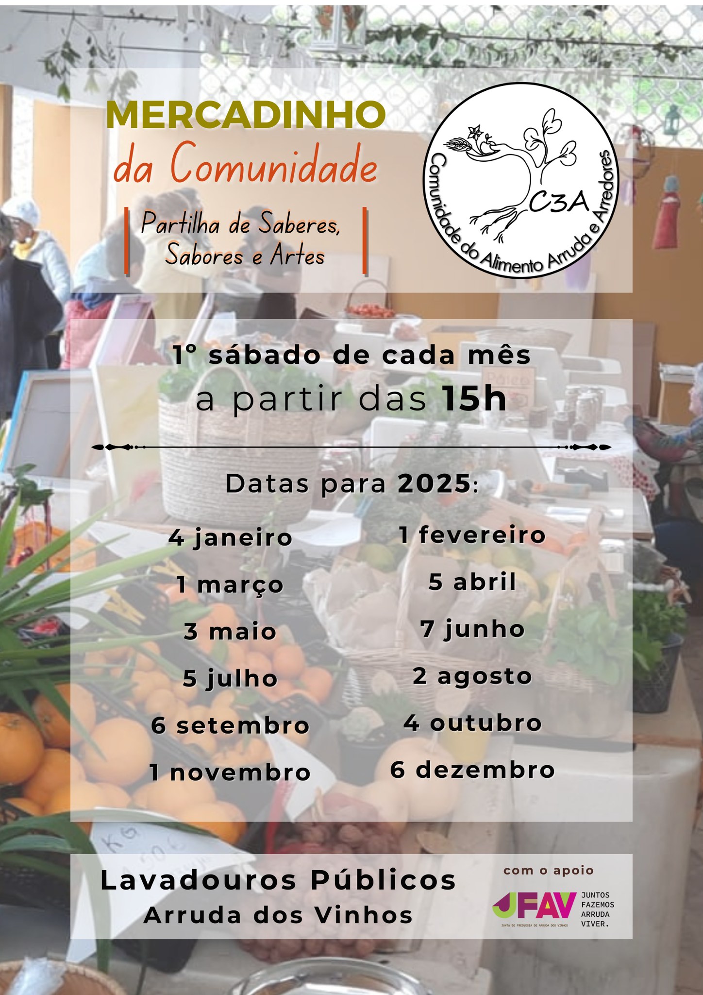 Mensalmente, dinamizado pela Comunidade do Alimento de Arruda, com o apoio da Junta de Freguesia de Arruda dos Vinhos.
