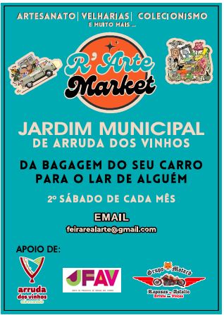 R´Arte Market Arruda dos Vinhos Segundo sábado de outubro A partir das 9h até às 17h Link da inscrição https://forms.gle/3rncuX6QtxrcbaqJ6 + Adicionar ao Google Calendar + Exportar iCal / Outlook